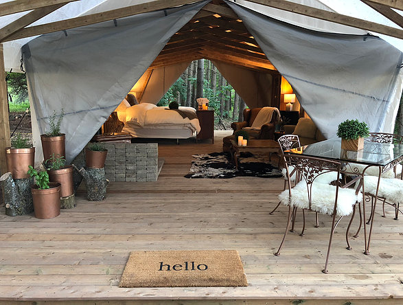 وهكذا جاءتها فكرة بناء خيمة ، بدلاً من كوخ، أو منزل لإقامة المتدربين، فقامت بالكثير من البحث والتعرف على تجارب البناء، والاطلاع على المصانع، والتصاميم المختلفة، وأنواع الأخشاب وجودتها، من أجل تصميم خيمة فاخرة بمستوي الأجنحة الفندقية الراقية، تتضمن كافة مزايا الفخامة في الفنادق، ولكن الفرق هو وجودها في أحضان الطبيعة، فأنشأت خيمتين لهذا الغرض، فقامت ببنائهم باستخدام عوارض وأسقف خشبية خاصة، ذات أحجام ومواصفات معينة، واستعملت أقمشة مقاومة للبلل والتسريب، وعلى قدرة عالية من احتمال الثلوج، ووضعت في كل خيمة، مدفأة وقطع نحاسية عتيقة، وقطع جلدية، لتعطي المكان الطابع الريفي، كما قامت بفرشها بأثاث خشبي صديق للبيئة مصنوع من بقايا الأشجار المحيطة بالمكان.